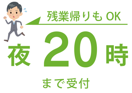 交通事故の治療は、早期回復の為に定期的に通院する必要があるのですが、お仕事が忙しい方や、用事があってどうしても日中に通院できない場合があります。立花接骨院では20時まで受付することができます。残業が多い方でもしっかりと通院することができますのでお気軽にご相談ください。